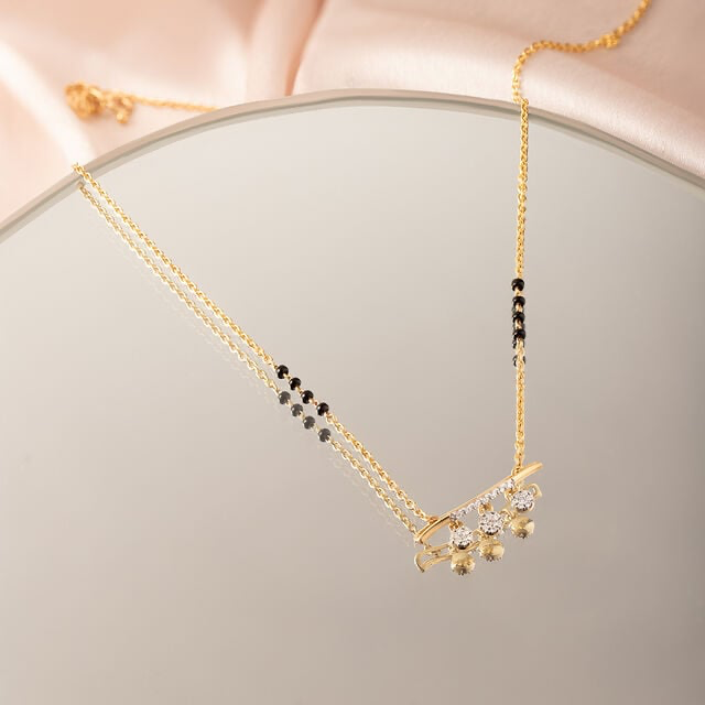 Are you a visionary fashionista planning fashion hits in advance, even for your everyday life? Here’s how you can embrace understated sophistication on the daily! Opt for the chic 14 KT yellow gold Vati mangalsutra, brought to aesthetic life by a trio of glistening diamonds suspended from a refined gold bar.